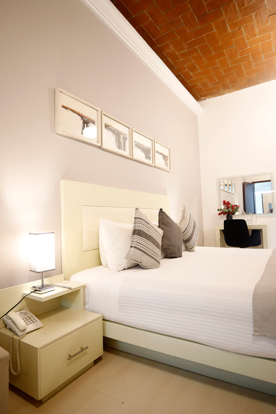 Las paredes en tonos neutros resaltan la textura del ladrillo petatillo en el techo, mientras que las sábanas blancas, combinadas con cojines y pie de cama color gris, aportan calidez y armonía visual. Es un espacio donde cada detalle dialoga con la esencia de Oaxaca: artesanal, sereno y profundamente humano.